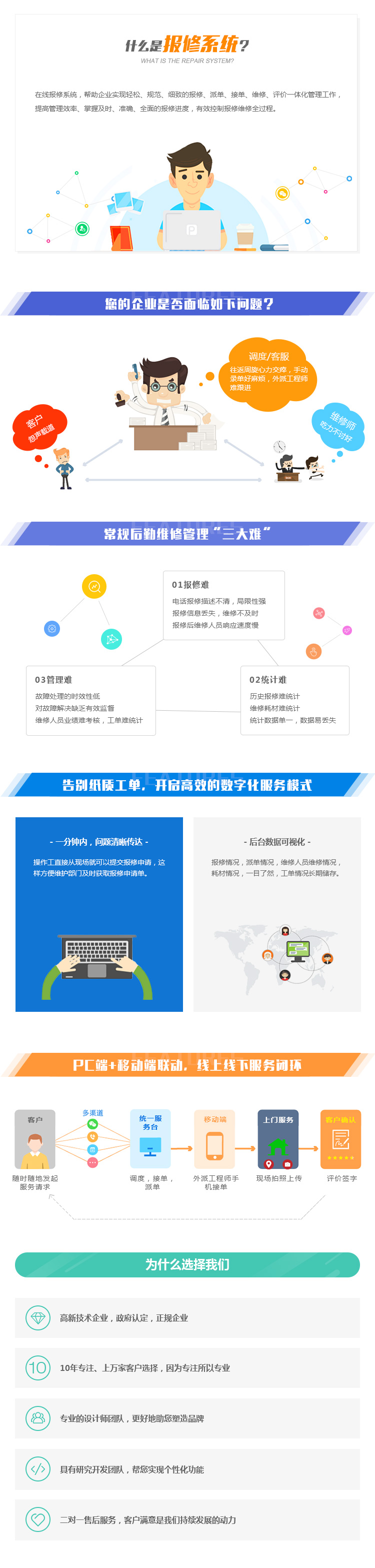 线报修系统,帮助企业实现轻松、规范、细致的报修、派单、接单、维修、评价一体化管理工作,提高管理效率、掌握及时、准确、全面的报修进度,有效控制报修维修全过程。